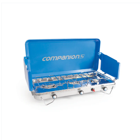 The Companion Deluxe 3 Burner Stove features 3 stainless-steel burners with a combined output of 23,600 BTU. Includes built-in windshields, chrome-plated drip trays, and foldable legs for convenience.