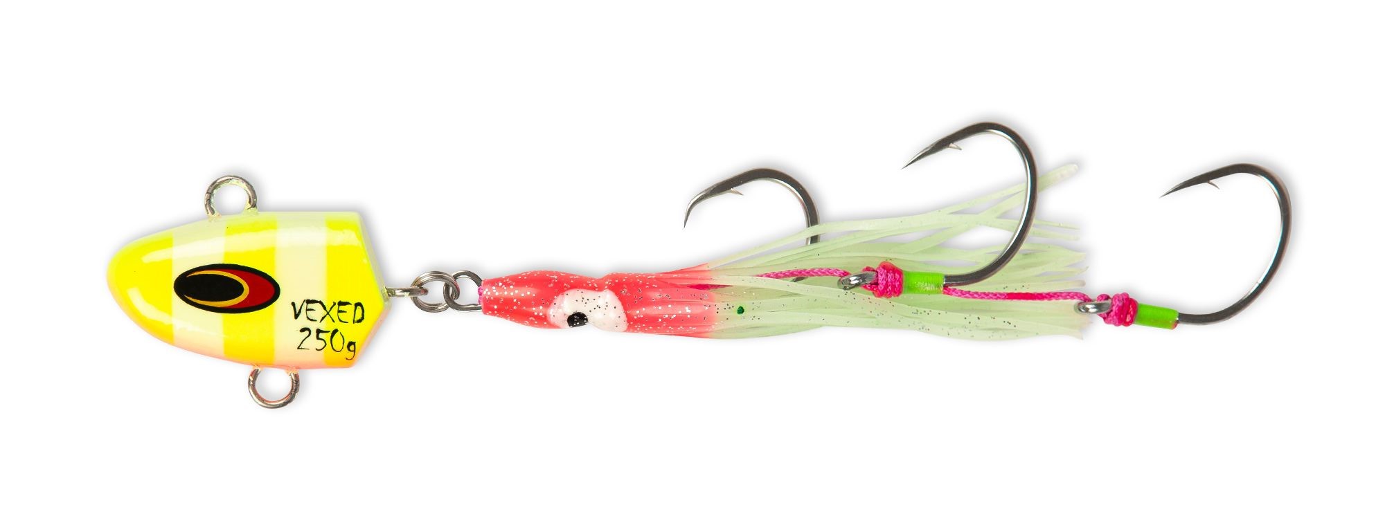 The Vexed Bottom Meat is the first hybrid jig/bait assist of its kind in the world. Whether it’s a full moon, northerly wind, strong current, dud tide, cold water temp? Everyone has put a little sneaky bit of bait on a jig head right? Well I’m sure guilty of it and was sick of missing monster bites , not to mention having bait ripped off my jig head. It was 2am one morning when this idea woke me up and out to the shed I went to used a bit of creativity. Long story short the Vexed Bottom Meat was born and we are into the 3rd improved design now using a circle hook on the top and a glow/UV skirt for more attraction and a target for the fish to attack the top circle hook. I designed these with 3 hooks rather than 2 because 3 hooks hold a longer fish strip bait, whole squid or octopus leg straight. A straight streamlined bait glides to the bottom faster and better presented than a bent up flappy bait with 2 hooks in it. The bottom meat can be used on a slow pitch PE1.5-PE 3 outfit far more effectively than a tradition paternoster rig. Available in 20gm, 40gm, 60gm, 80gm, 110gm, 150gm, 200gm, 300gm, 500gm, 750gm and 1000gm