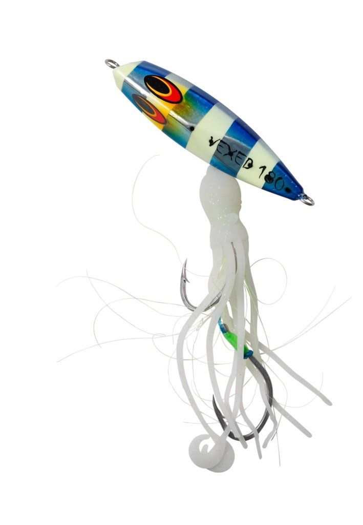 The Inchiku jig was developed by Japanese commercial snapper fisherman many decades ago. This technique involved fishing unattended rods in rod holders allowing a couple of anglers to use multiple rods at the same time. The original Inchiku jigs were 40g-100g, all the same colour, looked extremely simple and usually had tiny size 4 hooks to pin smaller snapper and other small mouthed species. Introducing the VEXED DHU INCHIKU. How could we improve this style for Australian conditions? Firstly we made the DHU Inchiku heavier and more compact to get them down faster and deeper. Then we incorporated larger super sharp hooks to better suit our larger and stronger Aussie fish. Next we improved the old school PVC octopus assist by using our own more durable, scented, super stretchy, high intensity UV/Glow Flashy Occy Head Assist. Add this Super Occy to our range of proven Vexed Bottom Meat colour patterns and you have the best Inchiku ever made. The DHU INCHIKU will catch many species including: Dhu Fish Snapper Groper Coral Trout Cod Red Emperor Cobra King Fish