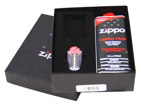 A Zippo lighter gift kit is the perfect way to give a Zippo windproof lighter. This gift kit includes a 6-flint dispenser, and a 4 oz. tin of Zippo Premium Lighter fluid. Add any classic standard size Zippo lighter for a distinctive presentation. Comes packaged in an environmentally friendly gift box. Not suitable for Zippo Slim or Blu2 lighters. (Lighter not included)